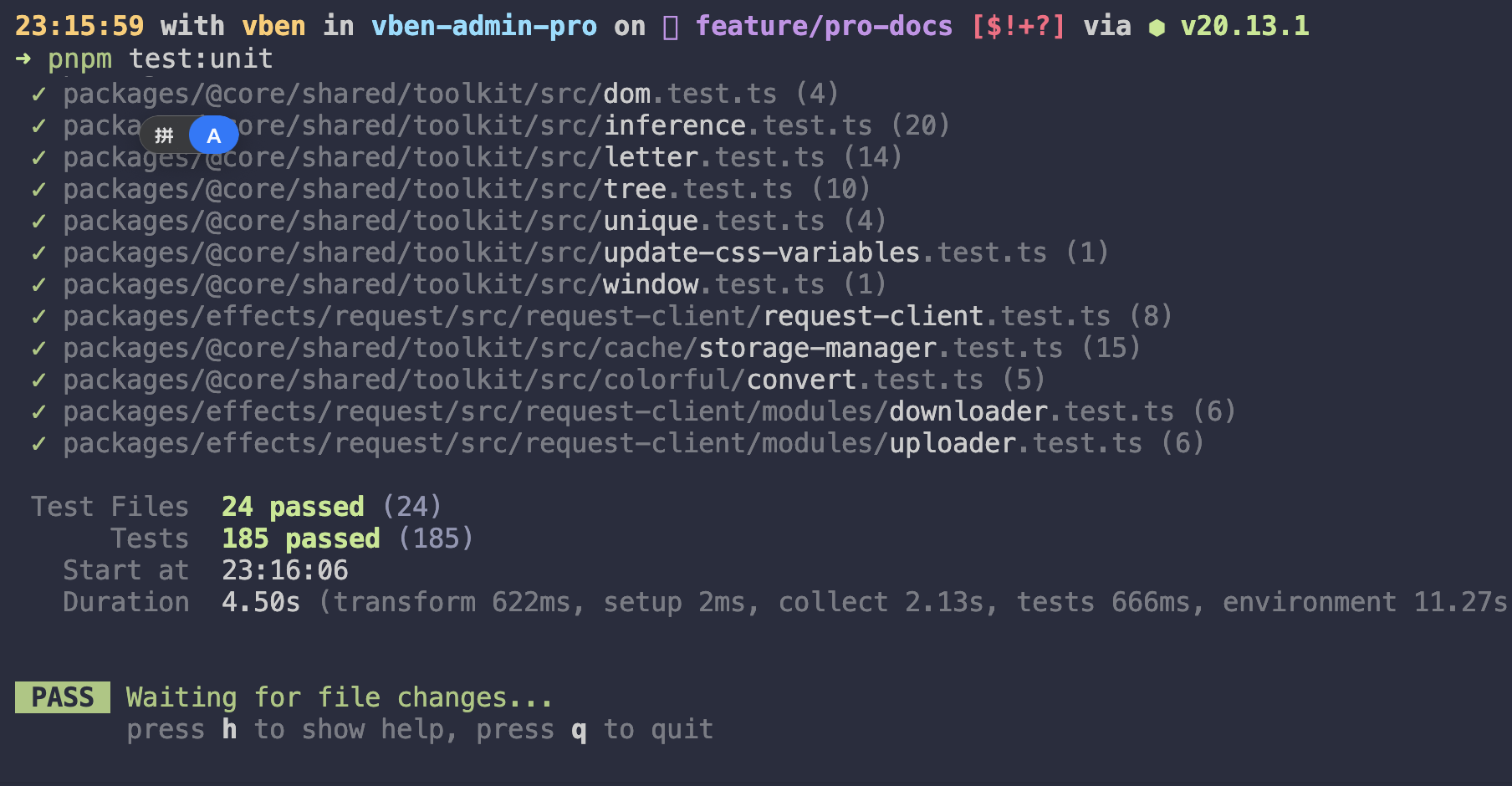 项目中已经有一些单元测试用例,可以搜索以.test.ts结尾的文件查看,在你更改到相关代码时,可以运行单元测试来保证代码的正确性,建议在开发过程中,保持单元测试的覆盖率,且同时在 CI/CD 流程中运行单元测试,保证测试通过在进行项目部署。
